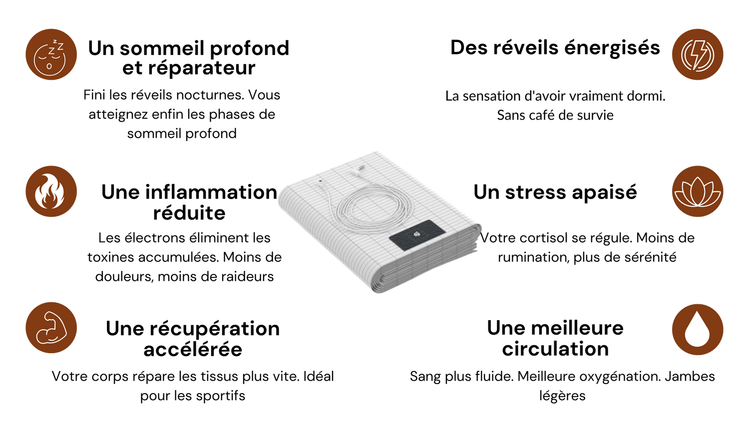 La connexion à la Terre est naturelle et non invasive. Toutefois, si vous portez un pacemaker ou êtes sous anticoagulants, nous vous recommandons de consulter votre médecin par précaution.