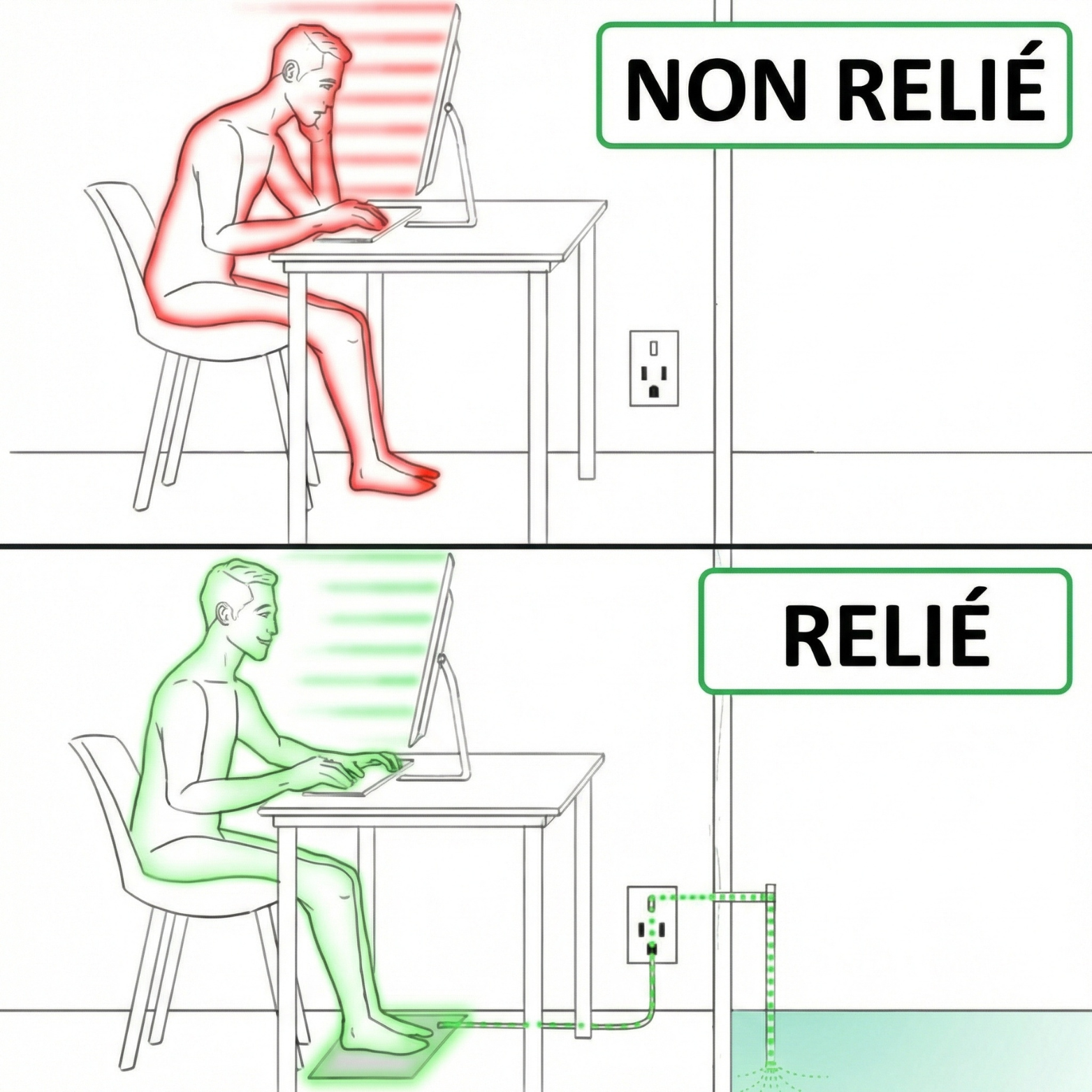 Le tapis contient des fibres conductrices. Vous le branchez à la prise de terre de votre maison. Quand votre peau touche le tapis, les électrons en excès dans votre corps s'évacuent vers la Terre.